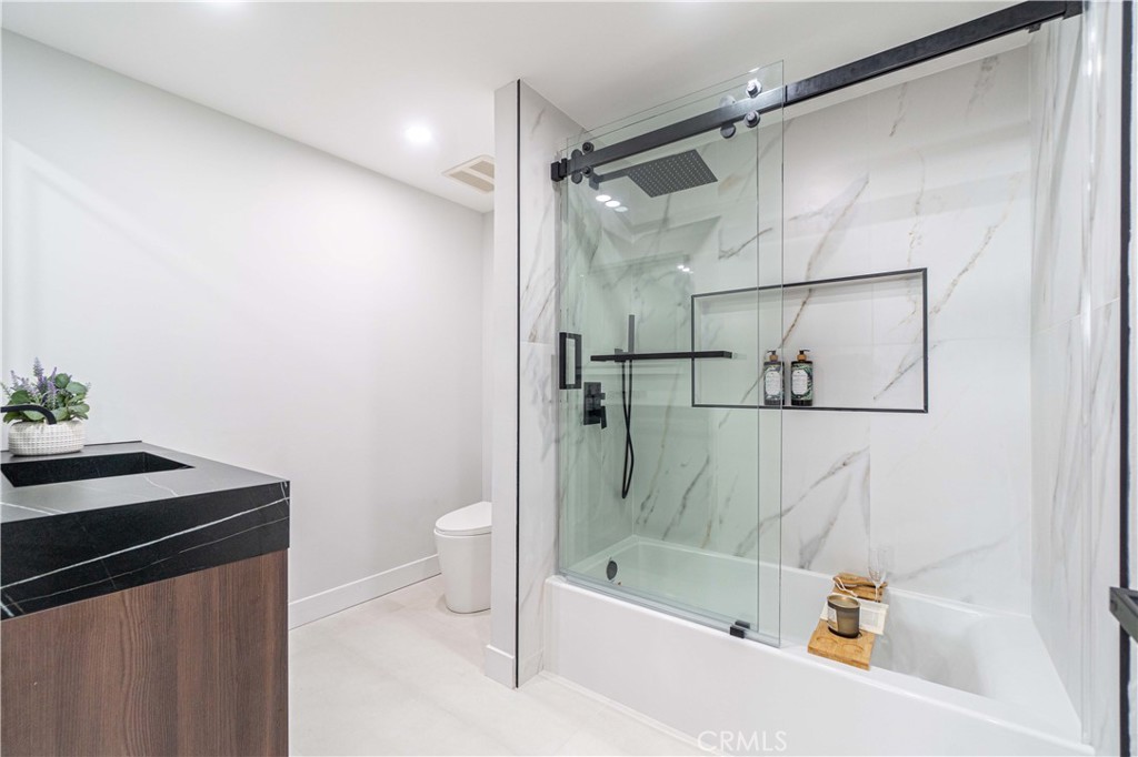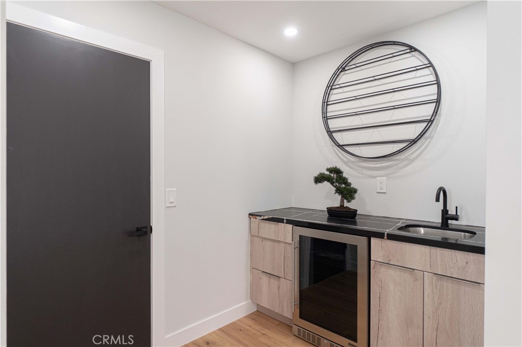 Stylish features abound, including thermal break aluminum windows with triple-pane glass and a tilt-and-turn feature, reminiscent of luxury high-end homes. An 8 ft thermal break bifold door in the family room and an 8 ft sliding door in the kitchen provide a seamless connection to the backyard, enhancing the overall contemporary design. To elevate entertaining, a bar area with a sink and beverage center is strategically placed near the family room, adding a touch of sophistication and convenience.
